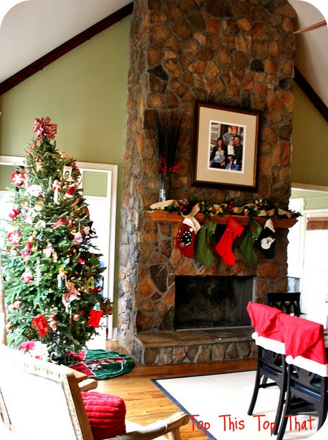 I bought these placemats at an after Christmas sale at Target a few years back for about $1.00 a piece. With my kids, placemats placed under my glass top,seem to last the season, without the glass top, maybe a day. I placed a large glass hurricane jar with red faux apples and a white candle. On the chairs, I made red santa hats out of red and white felt. See very top photo in this post for a view of the back of the Santa hats.